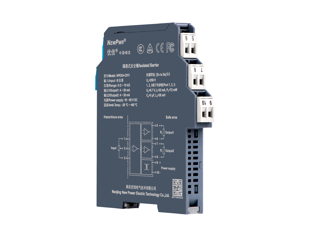 Potentiometer input isolated barrier, it converts the 3-wire potentiometer signals from a hazardous area into 4~20mA signals to a safe area by isolation. The input, output, and power supply are galvanically isolated from each other. The self-test function is also available on this device. Calibrate the apparatus or modify parameters by using a handheld programmer.