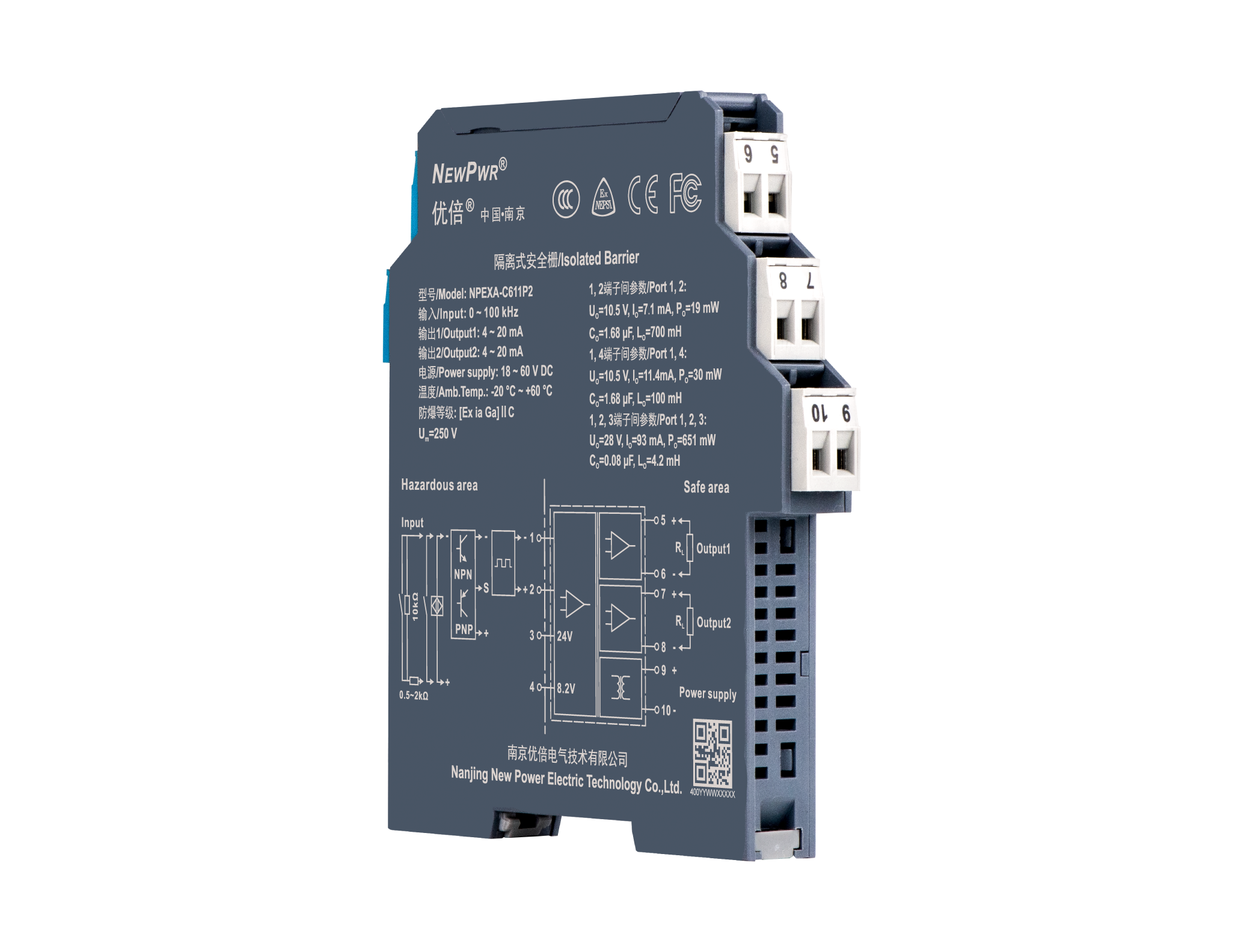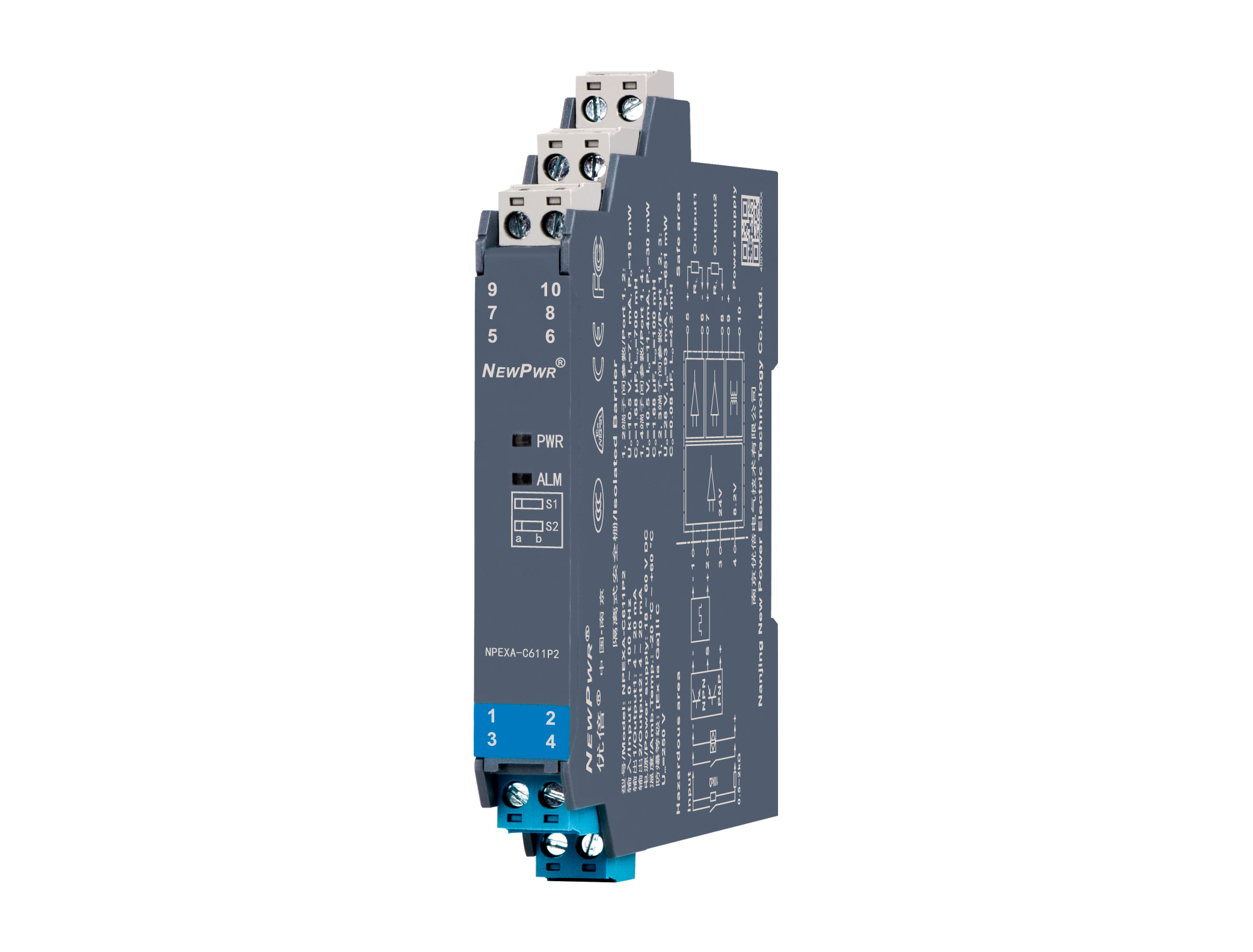 Frequency input isolated barrier, it converts the frequency signals from a hazardous area into 4~20mA signals to a safe area by isolation. The input, output, and power supply are galvanically isolated from each other. Calibrate the apparatus or modify parameters by using a handheld programmer.
