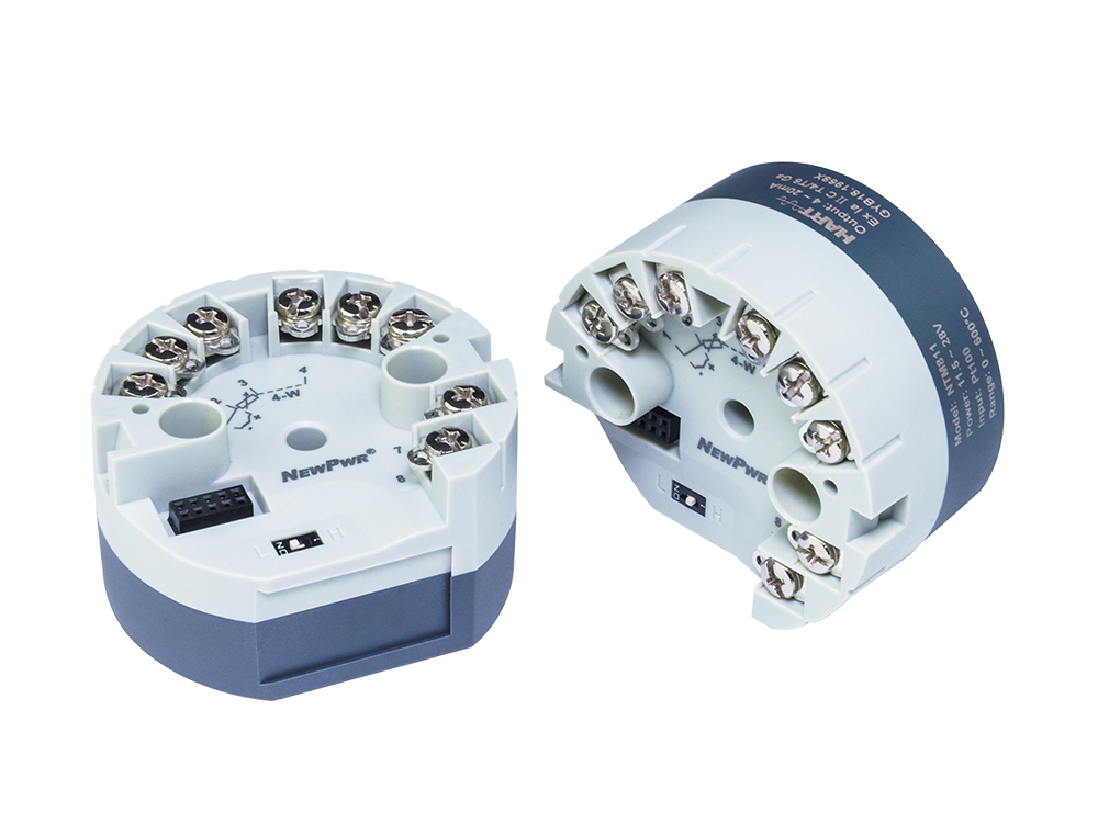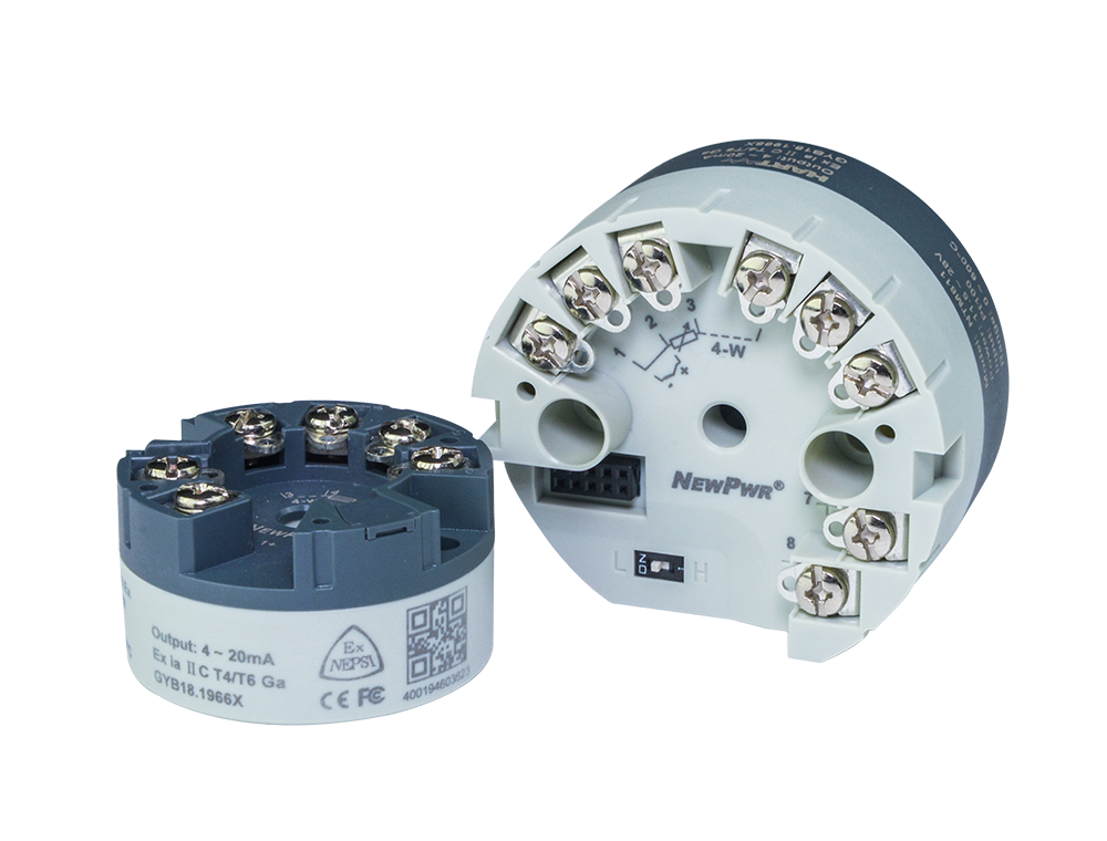 一体化温度变送模块,将现场的热电偶、热电阻信号信号经数字线性化处理,隔离转换为4~20mA输出,在输出回路上截取能量为工作电源。支持HART数字通信。